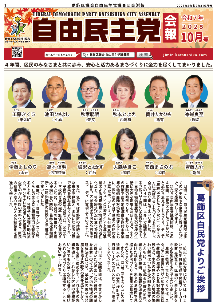 Member議員紹介 秋本とよえ 秋家 聡明 安西 まさのぶ 池田 ひさよし 伊藤 よしのり 梅沢 とよかず 工藤 きくじ 大森 ゆきこ 齊藤 大介 高木 信明 筒井 たかひさ 峯岸 良至 所属議員一覧はこちら Activity活動報告 葛飾区議会 第1回定例会最終本会議終了 2025.03.27 葛飾区議会 第1回定例会本会議2日目の開催 2025.02.28 葛飾区議会 第1回定例会本会議が開催されました 2025.02.27 令和7年度葛飾区予算案の編成に関する要望書を提出しました 2024.12.17 【葛飾区議会第4回定例会の開催】 2024.11.28 【平沢勝栄代議士の報告会を開催】 2024.11.28 活動報告の一覧はこちら meeting report定例会報告・会派報 2025.10.06令和7年『会派報10月号』 令和7年度第3回定例区議会が28日間の会期で開催されました。 令和7年9月10日から10月7日の28日間の会期で第3回定例区議会が開催され、予算案4件、条例案5件、契約案10件、報告案6件、人事案3件、その他案2件、議員提出議案1件、請願6件、計37件についての審議が行われました。 1面:4年間の任期を振り返って 2面:一般質問 大森ゆきこ 「真の協働を目指した組織づくりと区内活性化を」 一般質問 池田ひさよし 「適正な区政運営のために将来を見据えた人事戦略を… 2025.07.01令和7年『会派報夏季(7月)号』 2025.05.05令和7年 『会派報 5月号』 2025.01.01令和7年 『会派報新春 1月号』 2024.11.18令和6年 『会派報11月号』 2024.08.10令和6年 『会派報8月夏季号』 定例会報告一覧はこちら 葛飾区自民党チャンネル Activity活動報告 葛飾区議会 第1回定例会最終本会議終了 2025.03.27 葛飾区議会 第1回定例会本会議2日目の開催 2025.02.28 葛飾区議会 第1回定例会本会議が開催されました 2025.02.27 令和7年度葛飾区予算案の編成に関する要望書を提出しました 2024.12.17 【葛飾区議会第4回定例会の開催】 2024.11.28 【平沢勝栄代議士の報告会を開催】 2024.11.28 活動報告の一覧はこちら