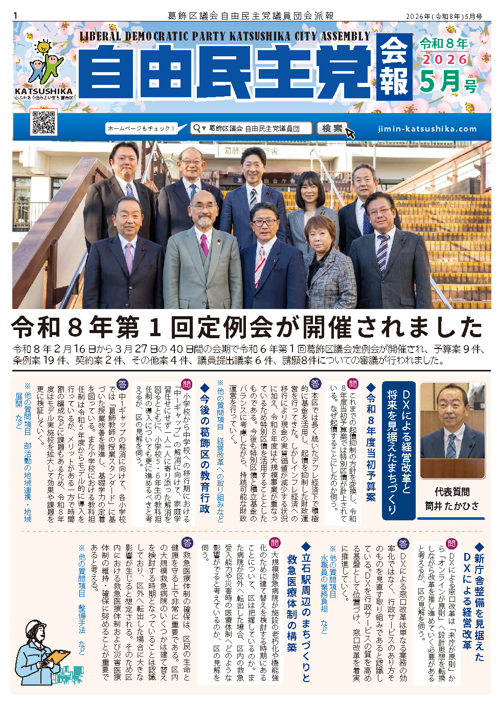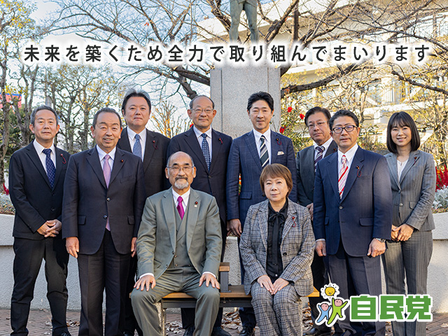 Member議員紹介 秋本とよえ 秋家 聡明 安西 まさのぶ 池田 ひさよし 伊藤 よしのり 梅沢 とよかず 大森 ゆきこ 高木 信明 筒井 たかひさ 竹本 としあき 所属議員一覧はこちら Activity活動報告 令和8年度葛飾区予算案の編成に関する要望書を提出しました 2025.12.21 葛飾区議会 第1回定例会最終本会議終了 2025.03.27 葛飾区議会 第1回定例会本会議2日目の開催 2025.02.28 葛飾区議会 第1回定例会本会議が開催されました 2025.02.27 令和7年度葛飾区予算案の編成に関する要望書を提出しました 2024.12.17 【葛飾区議会第4回定例会の開催】 2024.11.28 活動報告の一覧はこちら meeting report定例会報告・会派報 2026.01.07令和8年『自民党 会派報 新春号』 令和7年第4回定例区議会が15日間の会期で開催されました。 令和7年12月3日から12月17日の15日間の会期で令和7年第4回定例区議会が開催され、予算案2件、条例案12件、人事案3件、契約案13件、その他案1件、議員提出議案4件、請願1件、計36件についての審議が行われました。 1面:新年のあいさつ2面:一般質問 伊藤 よしのり 「着実な区政課題の解決と持続可能な区政運営を」 一般質問 竹本 としあき 「地域公共交通計画の推進」3面:常任委員会ダイジェスト4… 2025.10.06令和7年『会派報10月号』 2025.07.01令和7年『会派報夏季(7月)号』 2025.05.05令和7年 『会派報 5月号』 2025.01.01令和7年 『会派報新春 1月号』 2024.11.18令和6年 『会派報11月号』 定例会報告一覧はこちら 葛飾区自民党チャンネル Activity活動報告 令和8年度葛飾区予算案の編成に関する要望書を提出しました 2025.12.21 葛飾区議会 第1回定例会最終本会議終了 2025.03.27 葛飾区議会 第1回定例会本会議2日目の開催 2025.02.28 葛飾区議会 第1回定例会本会議が開催されました 2025.02.27 令和7年度葛飾区予算案の編成に関する要望書を提出しました 2024.12.17 【葛飾区議会第4回定例会の開催】 2024.11.28 活動報告の一覧はこちら